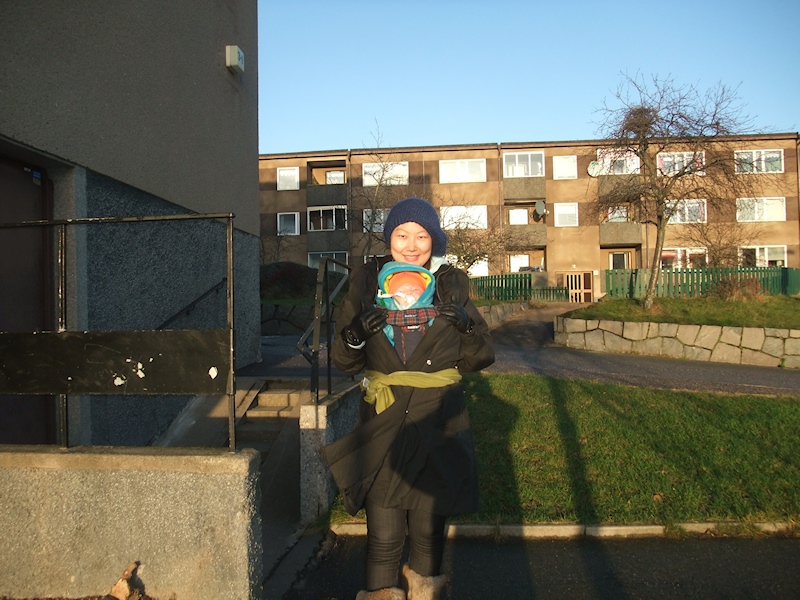 Wife taking the baby for a walk on an early winter day.