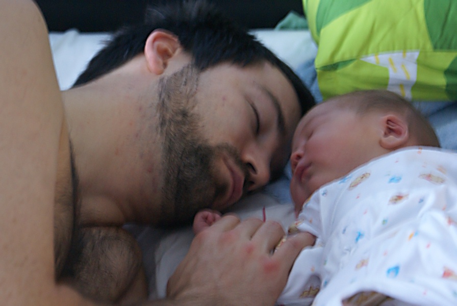 At home. I am as sleepy as the baby.