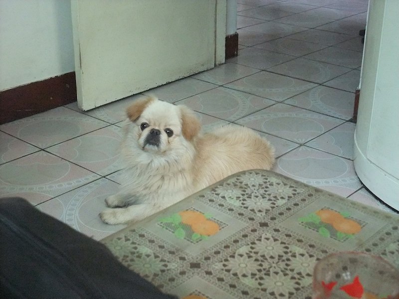 At Jenny's grandparents' home. This is their dog.