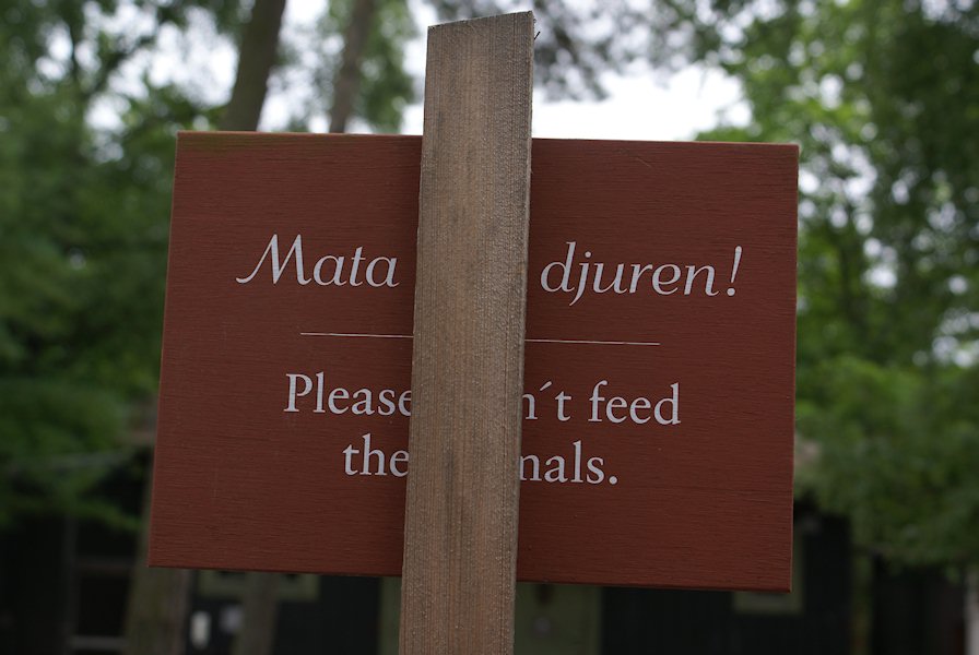 Funny placement of stick. The sign says "Please don't feed the animals", but with the stick placement it says "Please feed the animals" in Swedish on this side.