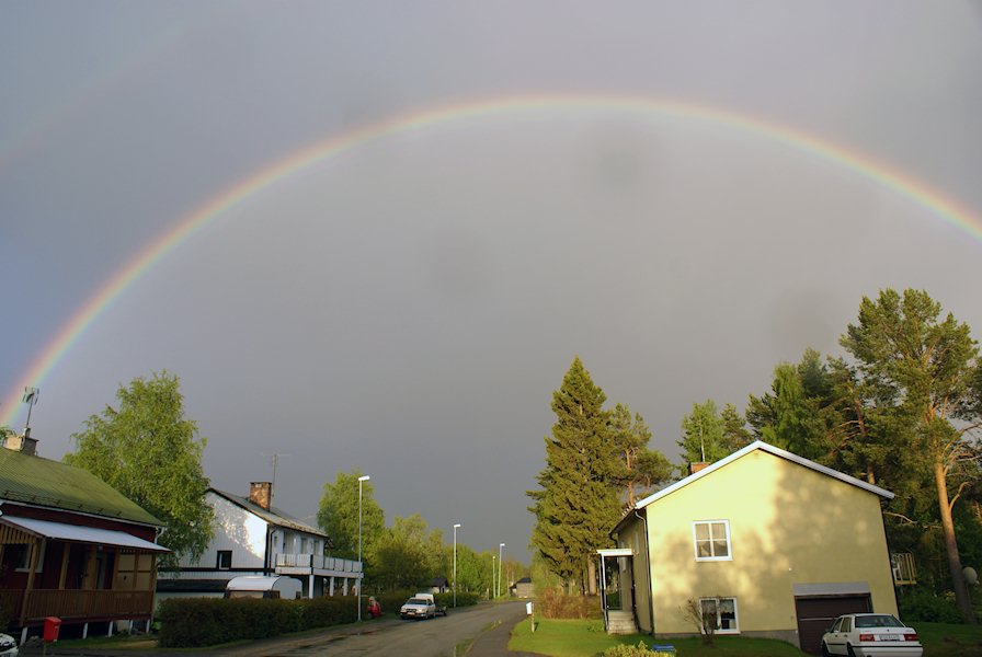 One of the most beautiful rainbows I have ever seen. It was very intense, and you can see a second ring as well. My parents' house on the left.