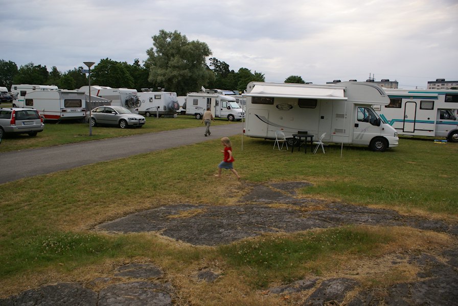 Frida running across the camping site.
