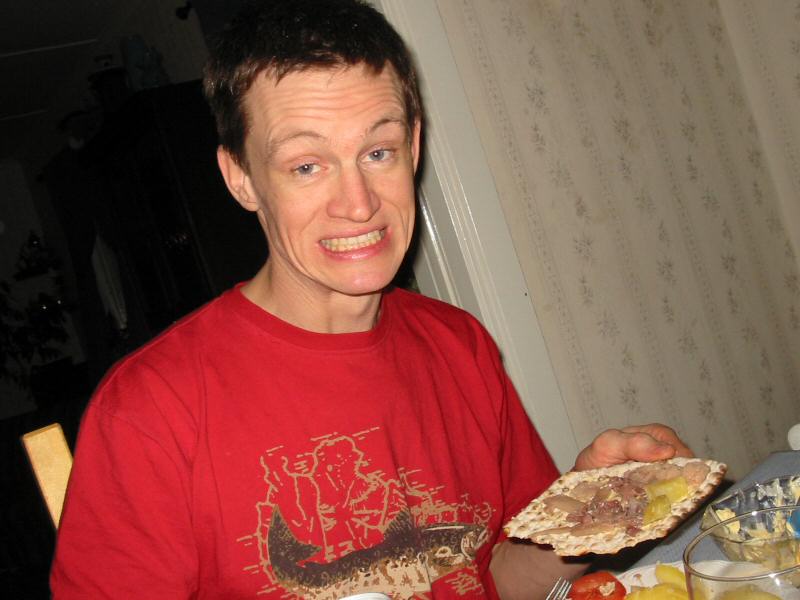 Fermented herring is best together with flatbread, potatoes and onions as Jocke is demonstrating here.