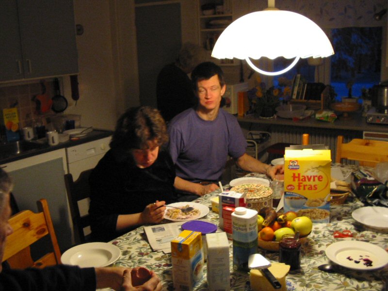 | My sister Noomi and her husband Jocke is eating breakfast. A piece of my dad is visible in the corner as well. |  |