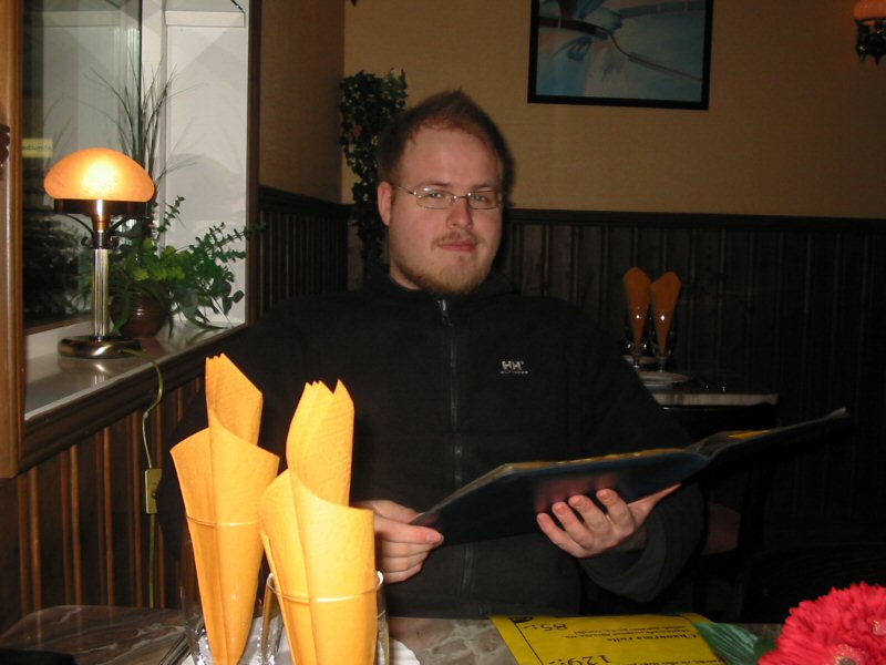 | I went to see Richard my former room-mate as well. He has now moved back to Lycksele and into an appartment that's surprisingly similar to the one we had in Luleå. Here we're about to order some pizza. |  |