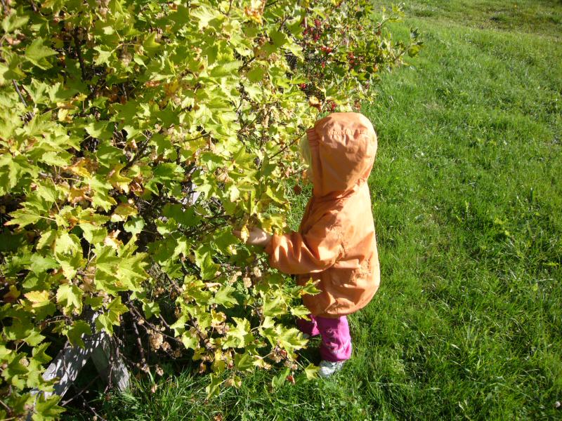 Frida picking whitecurrants.
