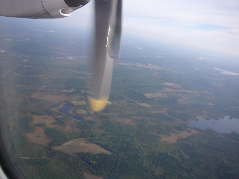 | On my way back again. Here I'm in the plane where we've just left Lycksele airport. I was able to spot Norrgård outside my window just as they told us we could use electronic equipment again. Had they allowed us to do it ten seconds earlier I might have gotten a better picture. Here Norrgård is just behind the propeller, above the yellow stuff. |  |