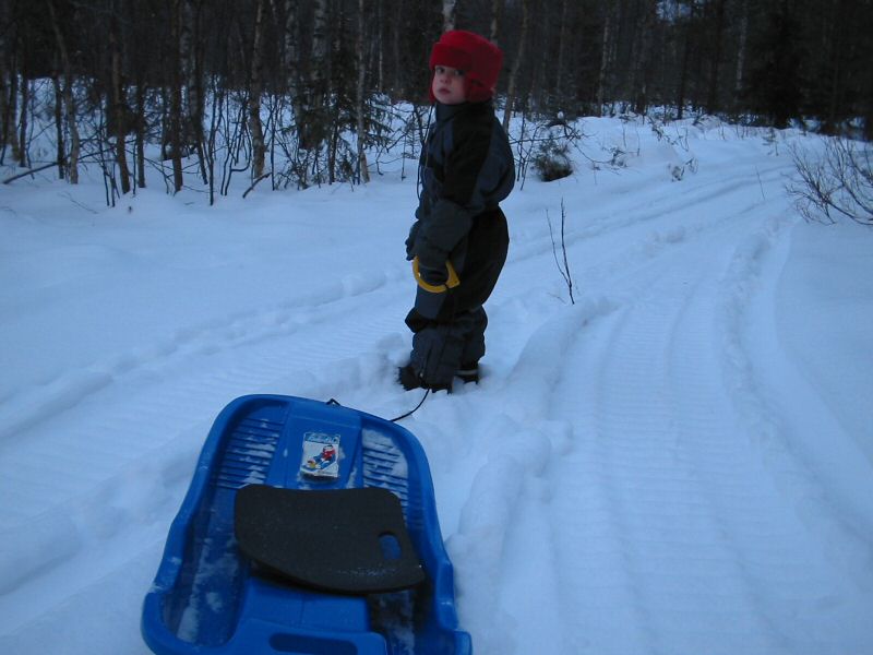 Johannes following a snowmobile track.