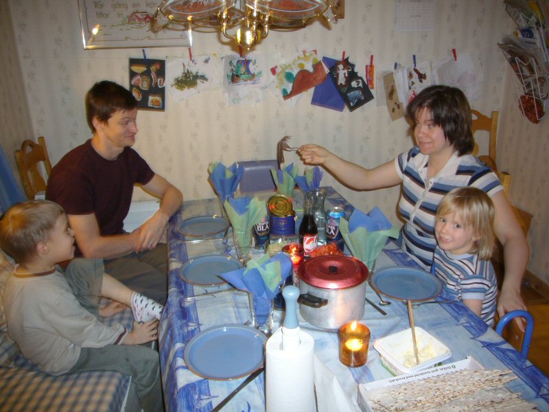My sister Noomi holding a fermented herring. Joakim, Johannes and Frida waiting to get a bite of this delicacy of Norrland.