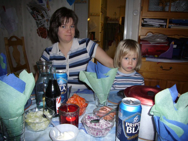 Noomi and Frida and all the accessories neccesary to make fermented herring really enjoyable. Crispy thin bread, butter, potatoes, red and yellow onion, and beer.