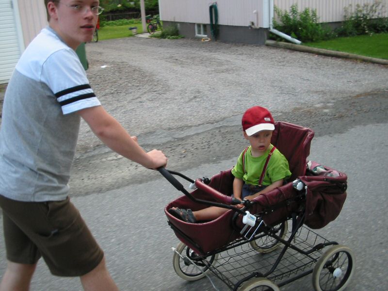 | At my sister's place. Here her son Johannes is taken care of by Josef as we're on our way to the local service station to buy some food. |  |