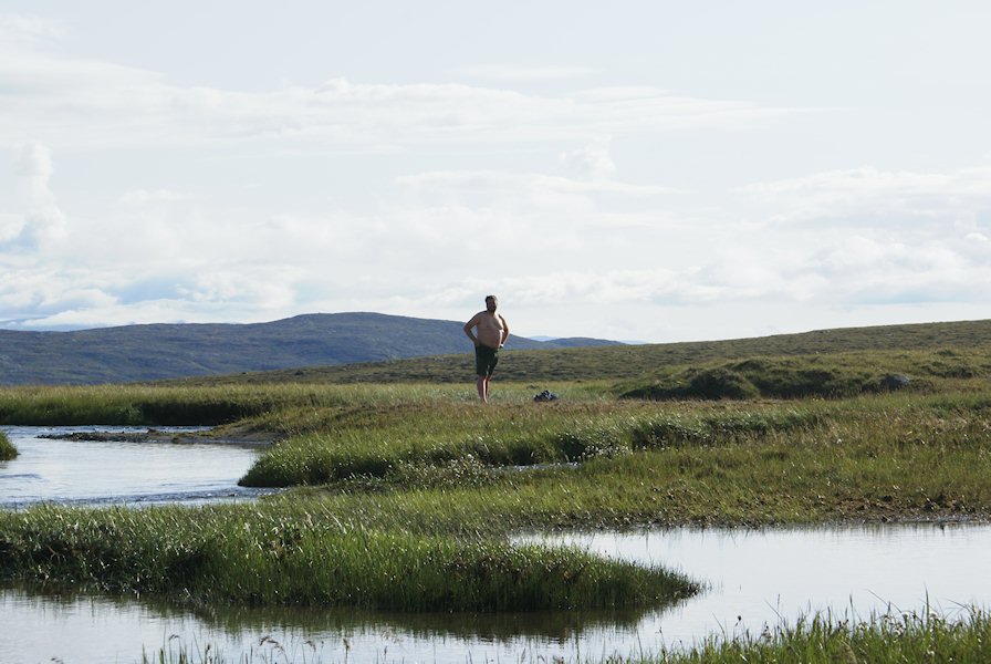 | Back by the tent. Marcus decided to take a bath in the cold creek water. |  |