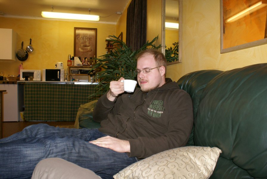 Having some coffee at my former roommate Richard's place.