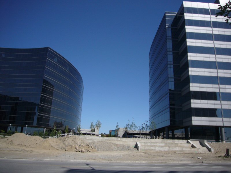 | One thing that impressed me about Toronto is that there are construction projects going on everywhere. Given the rate at which the city expands it's certainly necessary. Here are a couple of office buildings that were built across the road from the ATI office. When I first came to Canada this was an empty field. Now there are two large office buildings complete with a huge parking garage, roads and stuff. The left one had been in use for maybe a year when I left and the one on the right was about to be finished, and by now it's almost certainly in use. |  |