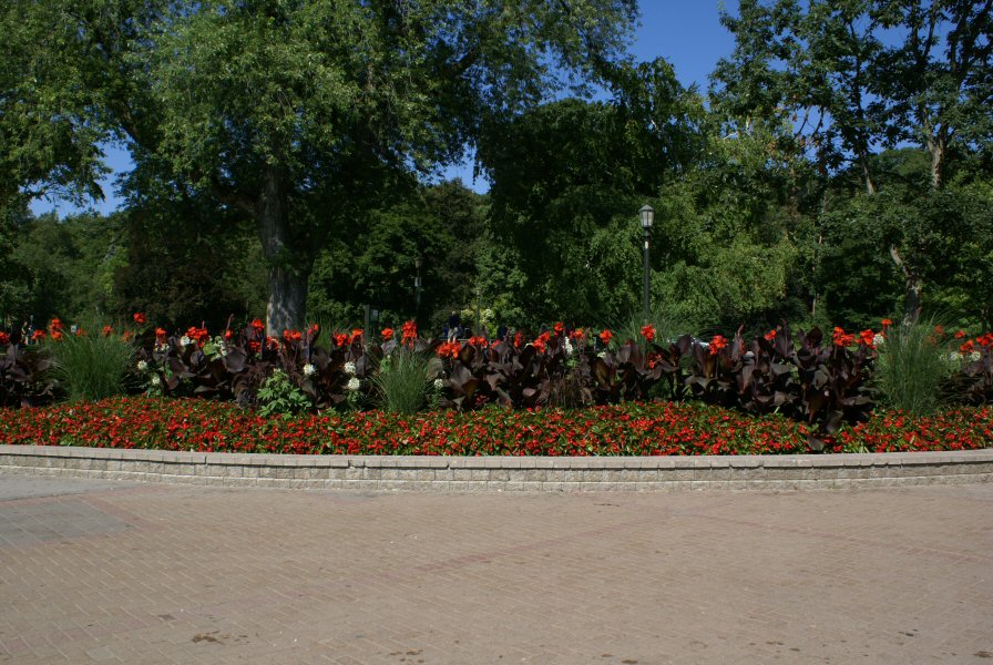The walkway along the Niagara river is covered with plenty of beautiful flower arrangements.