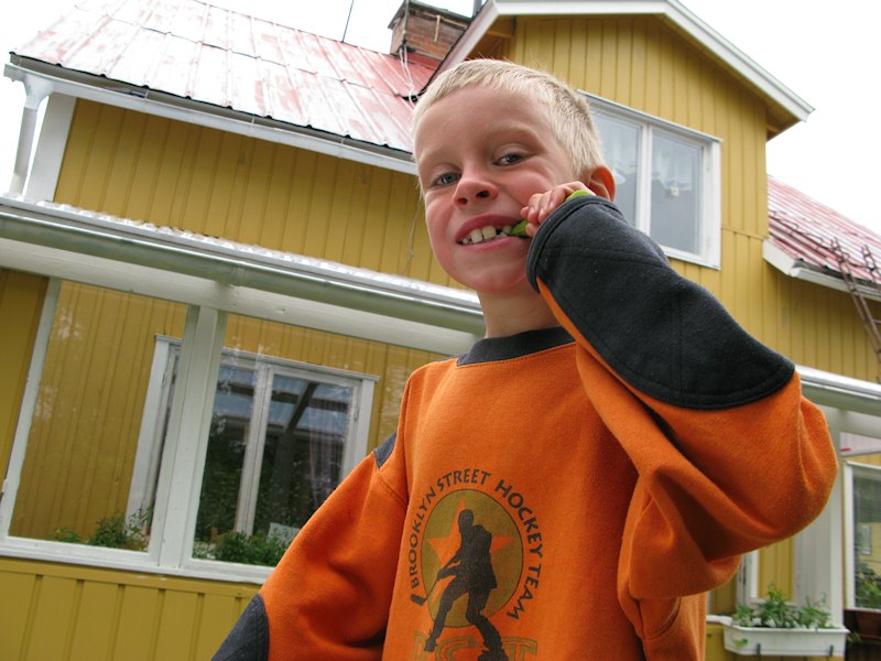 Johannes eating a rhubarb.
