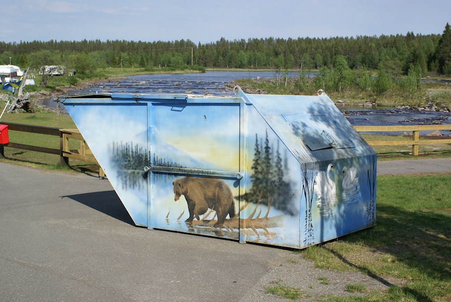 A beautifully painted garbage container.