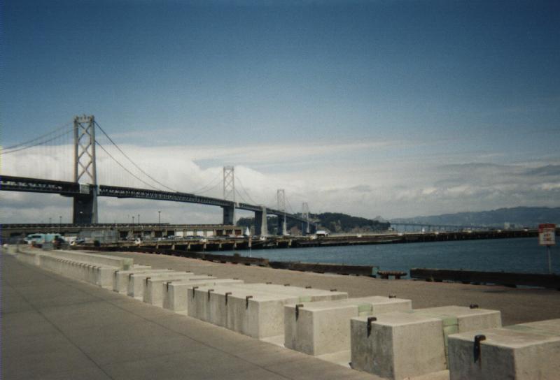 The Bay brigde reaching out to Treasure island, then continuing to the other side.