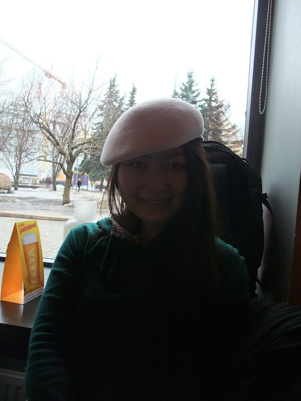 Jenny trying Stéphane's hat.