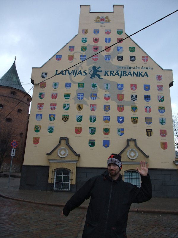 In front of special looking bank house.