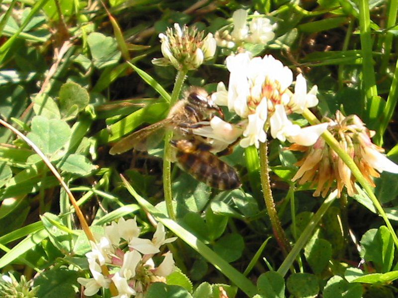 | My father does bee keeping as a hobby. Here's one of his bees working. Interestingly, with all the bees in the backyard I have never been stung (but have gotten wasp stings at a few times), well, until this summer when I got my first bee sting ever. Maybe because they didn't recognize me. It was one of the first days this summer and I just happened to walk very close to the beehive. |  |