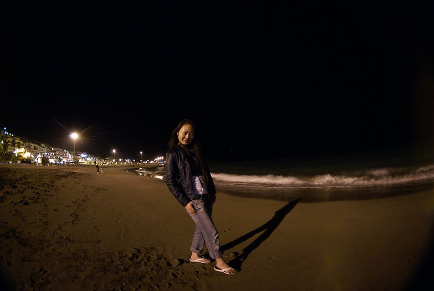 Walking down the beach at night.