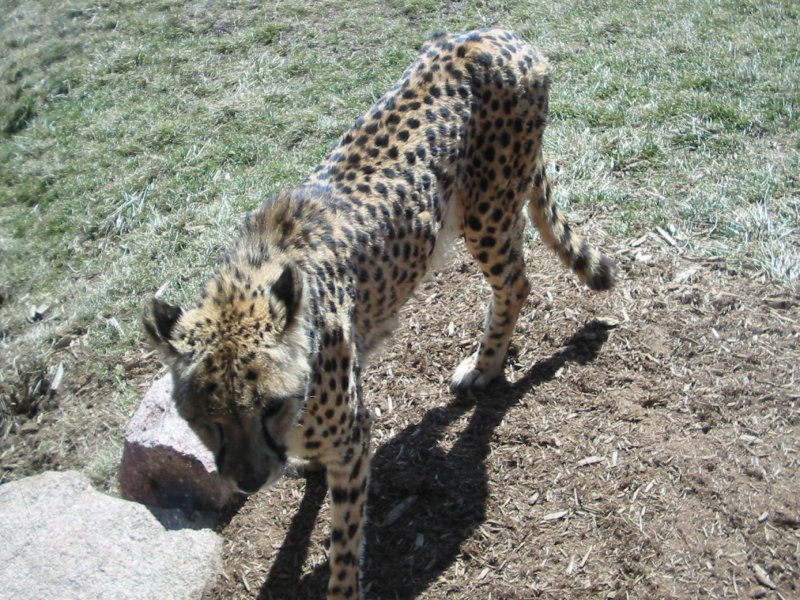 A leopard that seamed to like walking back and forth in front of the viewers on the other side of the glass.