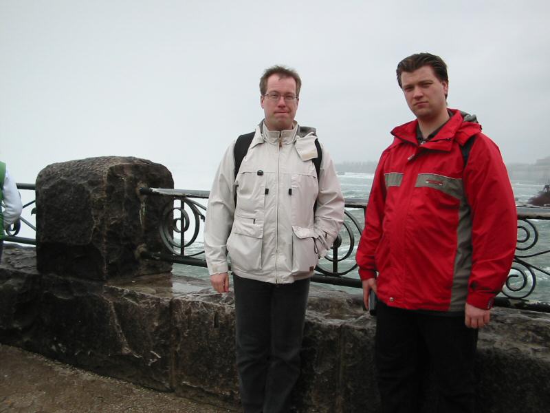 David (left) and Joel (right) posing in front of the Canadian fall. You can't quite see the actual fall, but it's right behind David and all the gray stuff to the left is the water it throws into the air.