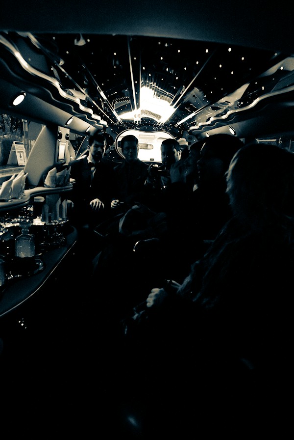 In the limo, heading out to pick up the bride.