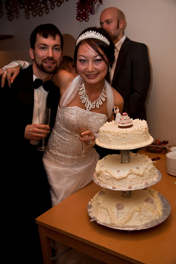Posing by the cake.