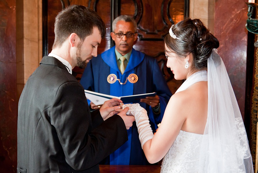 Putting the ring on her finger.