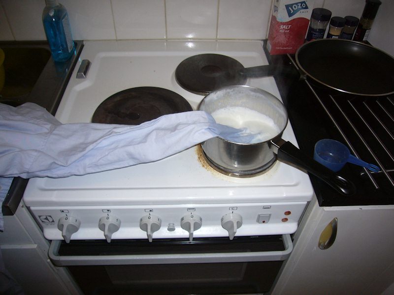 Attempting to get rid of red wine from the shirt by cooking it in milk. Worked for a friend, but not for me. Bah!