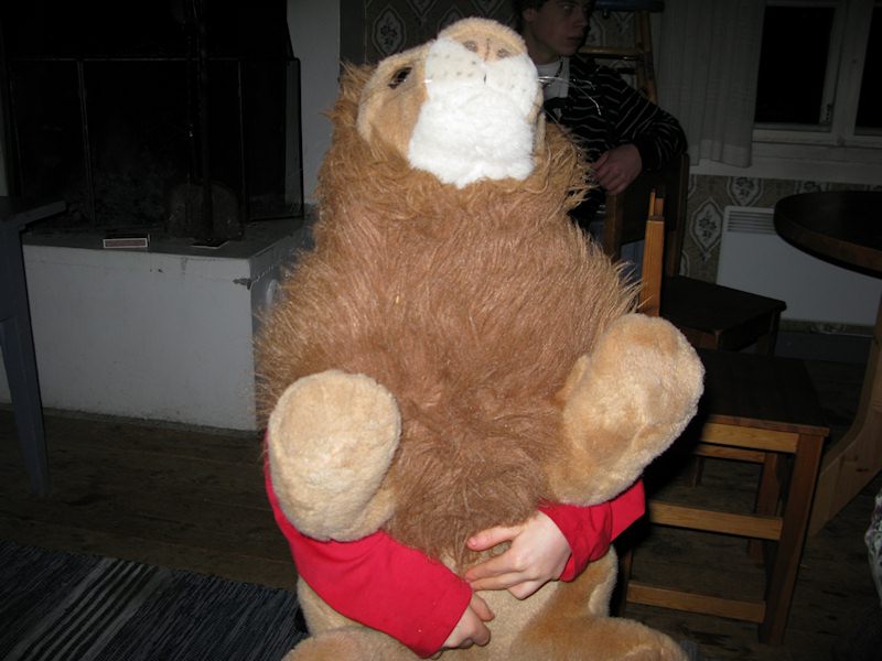 Frida hiding behind a lion.