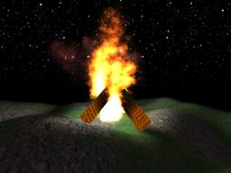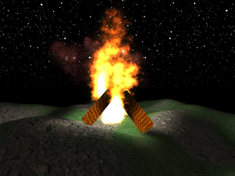 GL_ARB_shading_language_100This demo shows off a set of interesting (though hardly revolutionary) techniques. The fire is created with a standard particle system. However, instead of having just one texture for all particles I'm using an animated texture. The particles will change over time from the bottom of the fire to the top. The problem with that is that if that's done with normal 2D textures, then you need many draw calls to draw all particles that need different textures. To solve that I'm using a 3D texture containing all slices. This way the whole particle system can be drawn with just one draw call, but I also get interpolation between the different slices through the texture filtering, which gives smoother animation. In addition to that, I have added rotation to the particles, which makes the fire look more natural. To further improve the fire I have ensured that the fire shapes around the wood. This is done with some collision detection and some code to let the particles assemble again after being spread by the wood. The result looks pretty good.