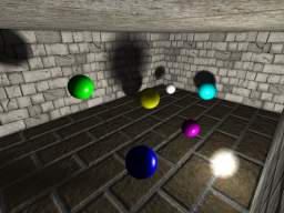 GL_ARB_shading_language_100This demo shows how to generate shadows through raytracing. This is easy enough to do with simple object such as spheres, which this demo uses. Shooting a ray through a list of spheres requires few computations. In fact, assuming the GLSL compiler generates optimal code it will only need 5 instructions per sphere, and then we're getting soft shadows for free. The limit is instead on the number of interpolators, which limits the number of spheres to 7 on current hardware, unless of course you go multipass (which would be straightforward).