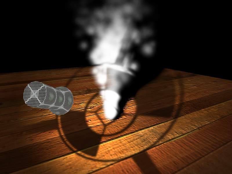 This demo shows a particle system creating a smoke effect. This smoke is lit by a partly shadowed spotlight with the smoke aswell as the ground being clearly shadowed accordingly. The shadow from the smoke is also projected to the ground (which is bumpmapped btw). One of my best demos IMHO.